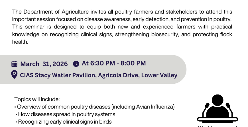 The Department of Agriculture is inviting all poultry farmers and stakeholders to an important Disease Information & Prevention in Poultry Seminar.