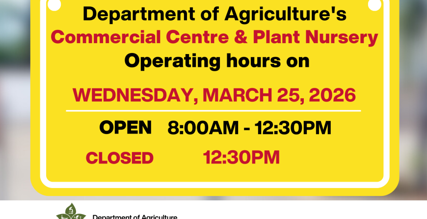 The Department of Agriculture wishes to inform the public of an early closure for the Commercial Centre, Plant Nursery, and Cayman Brac Office on Wednesday, March 25th, to facilitate a team training session.