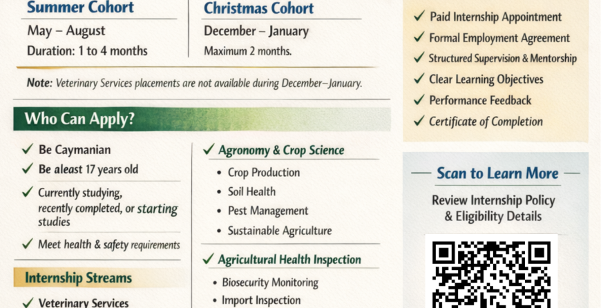 The Department of Agriculture Internship Program (DAIP) – 2026 Cohort offers paid internship opportunities under the Cayman Islands Government Paid Student Internship Programme. This structured programme provides students with hands-on experience in agriculture, veterinary services, plant protection, and agricultural health inspection.