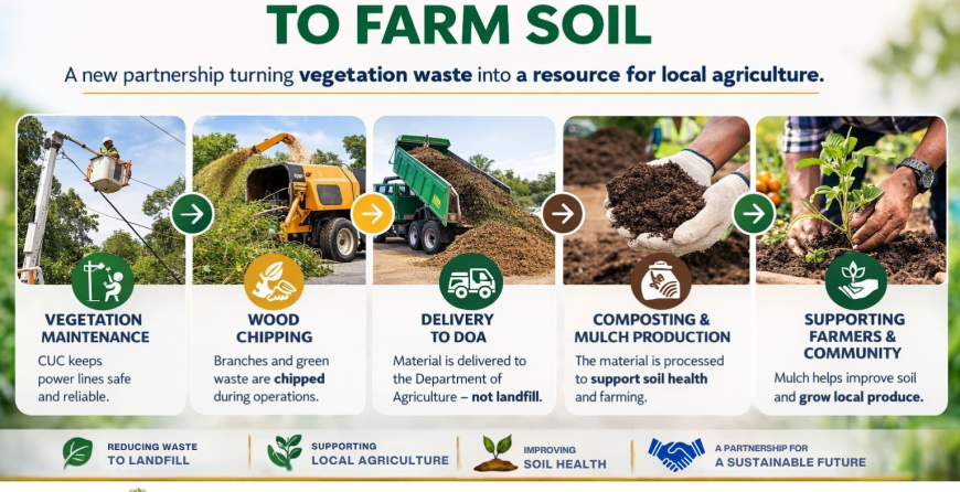 The agreement allows chipped vegetation material produced through CUC’s vegetation management activities to be delivered to a designated Department of Agriculture location, where it will be available for public and agricultural collection to support soil improvement.
