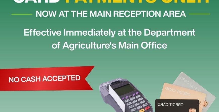 The Department of Agriculture wishes to advise all customers, stakeholders, and clients of the Import and Export Services, that they are now about to make card only payments at the main office’s reception area.